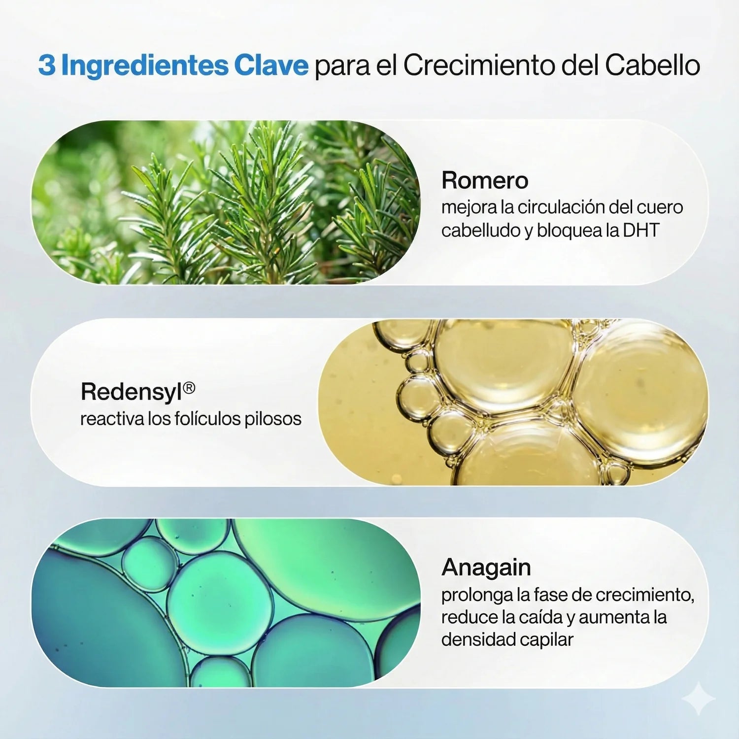 Con Redensyl, Aminexil, Romero y Anagain para activar el crecimiento y reforzar el folículo.